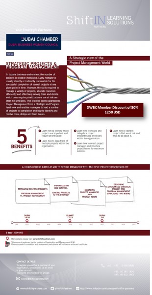 ShiftIN Partners are happy to announce new dates for Strategic Projects and Programs Management Course to be held in Dubai from 18th – 20th of November 2014. As part of their strategic partnership with the DBWC, ShiftIN Partners are happy to offer 50% discount to all registered DBWC members.