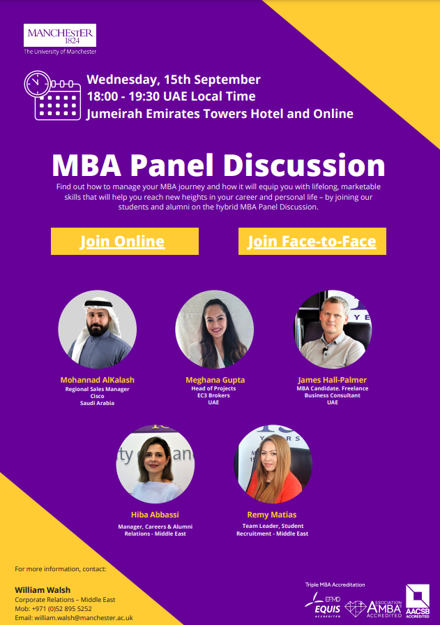 Our Partner, The University of Manchester Middle East Centre is organising a panel discussion with its MBA students and alumni. This is a great opportunity to learn more about the MBA experience for those looking to start their journey in January 2022.