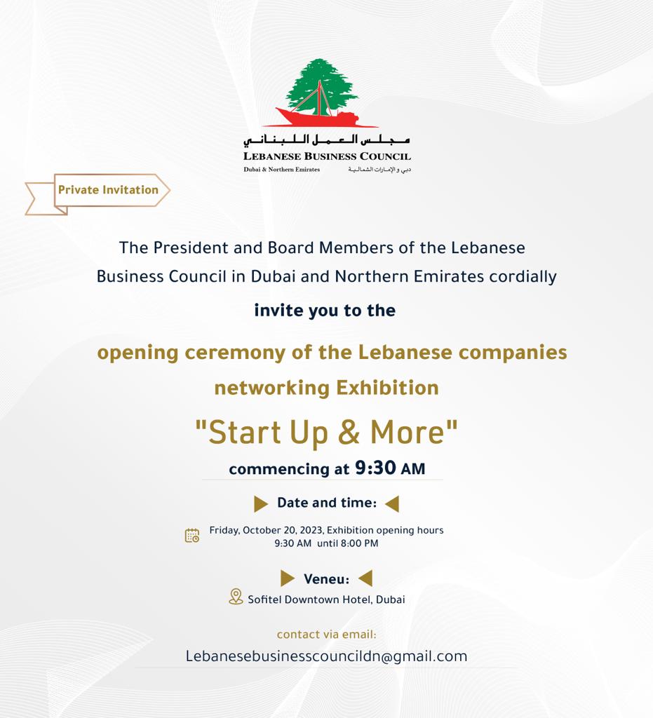 10/20/2023 9:30 am 10/20/2023 8:00 pm Asia/DubaiBiz Community Event- Start Up and More: The Opening Ceremony of the Lebanese Companies' Networking ExhibitionsDubai Chamberlebanesebusinesscouncildn@gmail.com