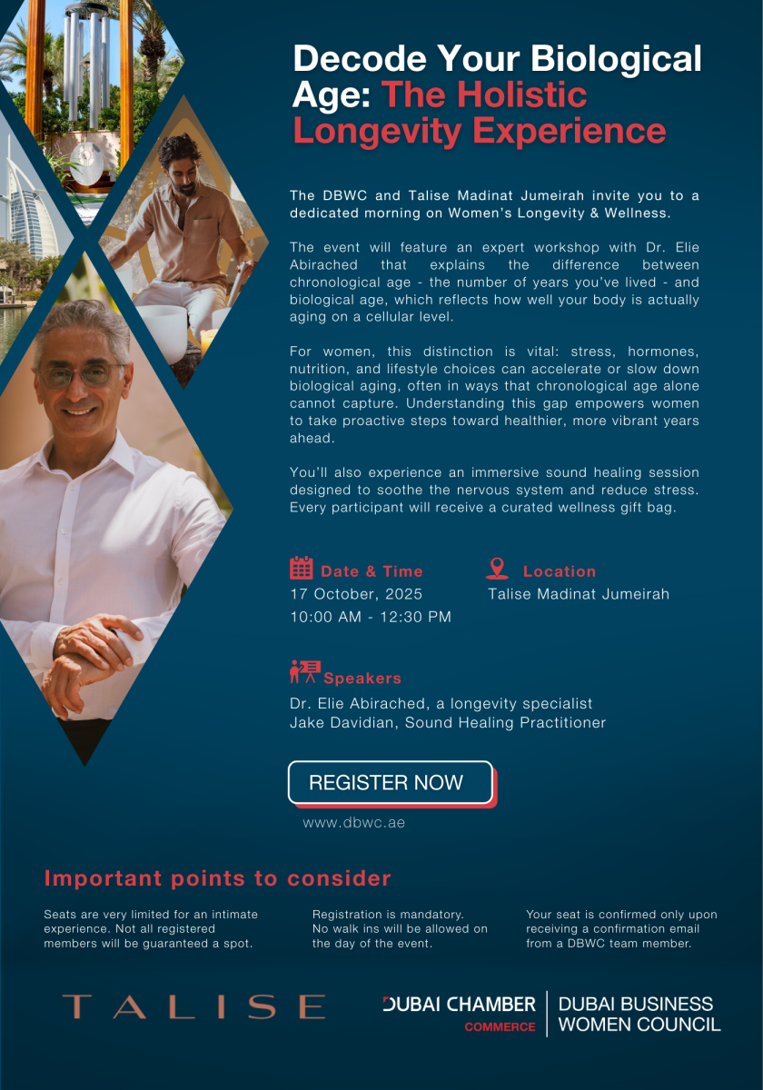 10/17/2025 10:00 am 10/17/2025 12:30 pm Asia/DubaiA DBWC Event- DECODE YOUR BIOLOGICAL AGE: THE HOLISTIC LONGEVITY EXPERIENCE WITH TALISE MADINAT JUMEIRAHDubai Chamber