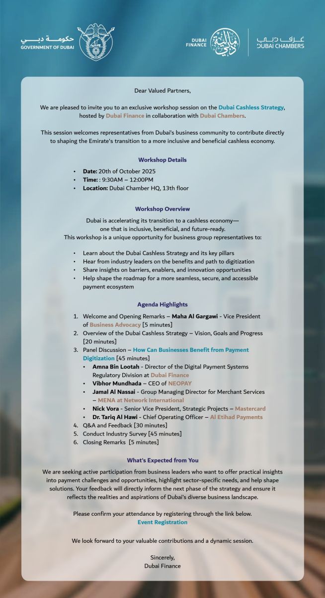 10/20/2025 9:30 am 10/20/2025 12:00 am Asia/DubaiA Dubai Chamber Event- Dubai Cashless Strategy with Dubai Chambers and Dubai FinanceDubai Chamber