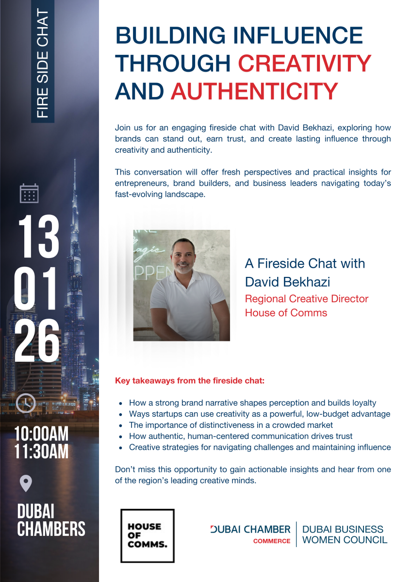 01/13/2026 10:00 am 01/13/2026 11:30 am Asia/DubaiA DBWC Event- Building Influence Through Creativity and Authenticity A Fireside Chat with David Bekhazi from House of CommsDubai Chamber