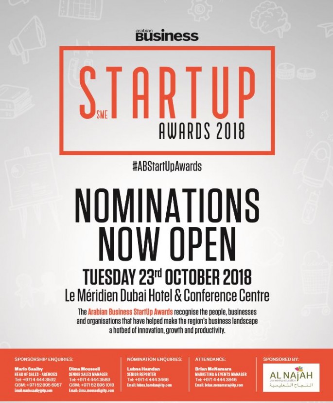 Arabian Business StartUp Awards 2018 - Nomination Closes Sept 6