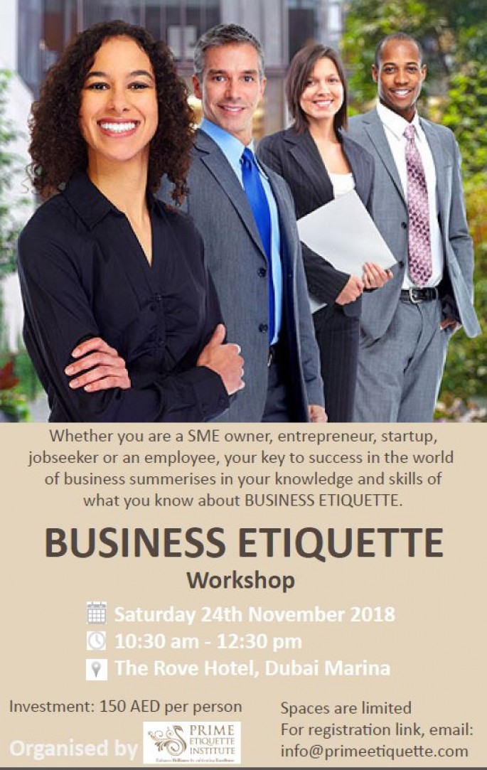 11/24/2018 10:30 am 11/24/2018 12:30 pm Asia/DubaiBusiness Etiquette WorkshopSpecial discount is available for DBWC Members emaDubai Chamber